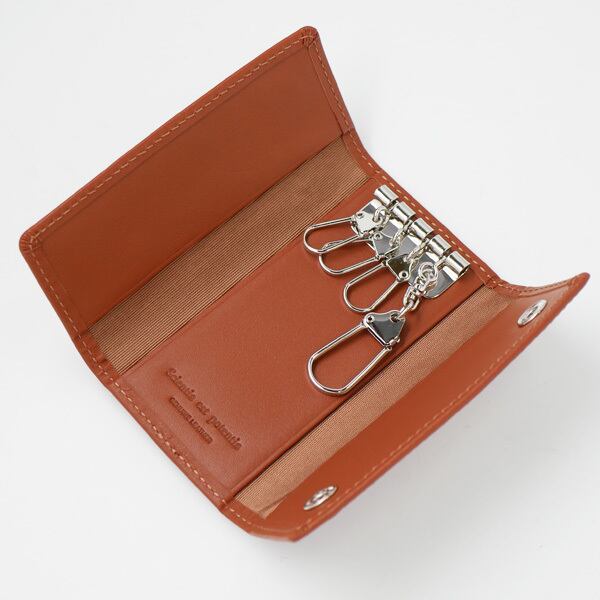 カラフルなソフトレザーを使ったキーケースです。三つ折りタイプのホックボタン留めで大切な鍵をやさしく守ってくれます。キーホルダーの数はバランスの良い4連にしました。金具はクロームメッキ加工仕上げでシンプルな仕上がりになっています。