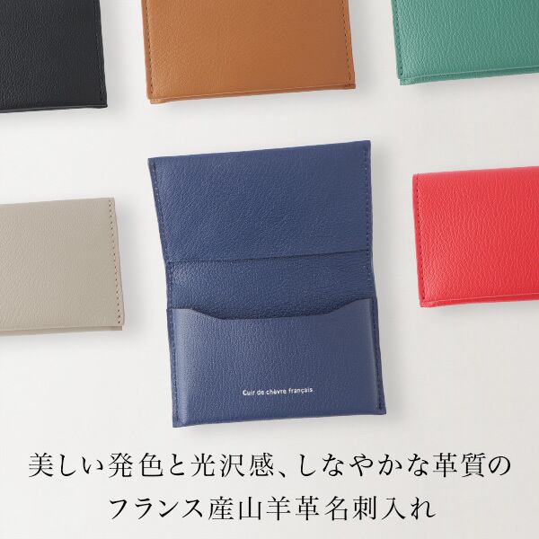 アリゾナ素材でつくったスリムタイプの名刺入れです。名刺入れとしての機能はいたってシンプルに。メインポケットは15~20枚の名刺が入れられます。またカブセの裏と背面にもマチ無しのカードポケットを設け、定期券や電子マネーなどのカード類を収納できます。