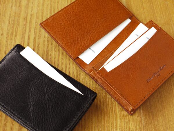 アリゾナ・シリーズのカブセ蓋つきの名刺入れです。三方が広がる「通しマチ」で名刺をたっぷりと入れられます。一般的な厚みの名刺なら約50枚収納できます。多忙なビジネスパーソン必携の名刺入れです。